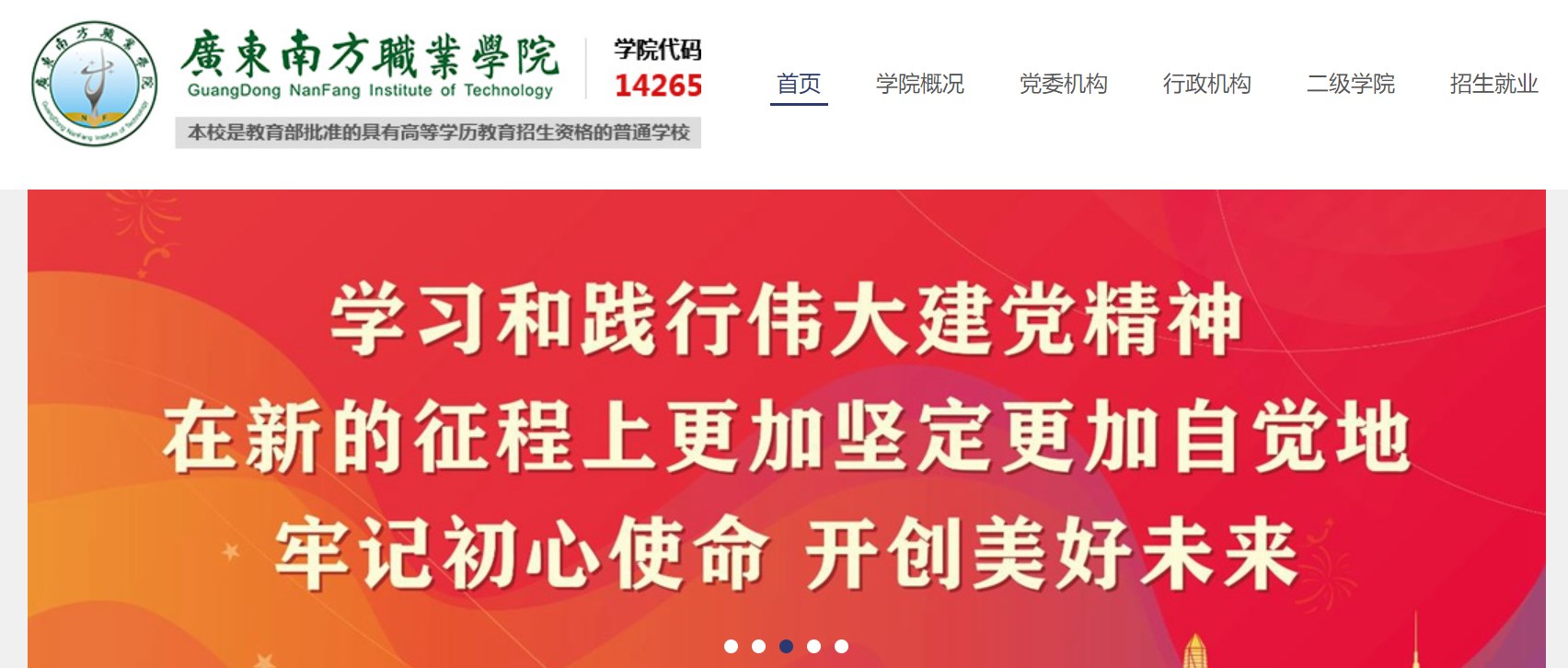 广东南方职业学院成立于2009年,是经广东省人民政府批准、教育部备案的全日制普通高等职业院校。学校认真落实立德树人根本任务,把人才培养质量放在学校工作的首位,不断深化办学特色和教育教学改革,全面提升办学实力和人才培养质量,以开拓创新精神,探索开创出多元化特色教育发展之路。2017年通过广东省教育厅组织的高等职业院校人才培养工作评估,2020年学校荣获“广东民办教育四十周年突出贡献机构”奖,戴初贤董事长荣获“广东民办教育四十周年突出贡献人物”奖。学院招生代码:14265。